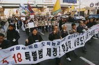 - 1990년 4월 16일 정원식 문교부장관과 이수호 전 전교조사무처장이 사립학교법 위헌심판변론을 위해 헌법재판소 재판정에 출석 악수를 나누고 있다. 정 장관은 전교조가 결성된 일 처음으로 전교조쪽 관계자를 만났다.
