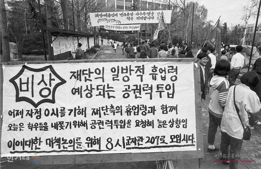 - 1990년 4월 16일 오전 10시 1대학 2총장문제로 진통을 겼어론 세종대가 지난 15일 0시를 기해 학교쪽이 무기한 임시휴업 조처를 내리고 경찰투입을 요청하면서 학내분규가 심화되는 가운데 박홍구 총장이 보직교수 등 20여명과 함께 7개월 만에 교내에 들어가려다 학생들의 저지되고 있다.