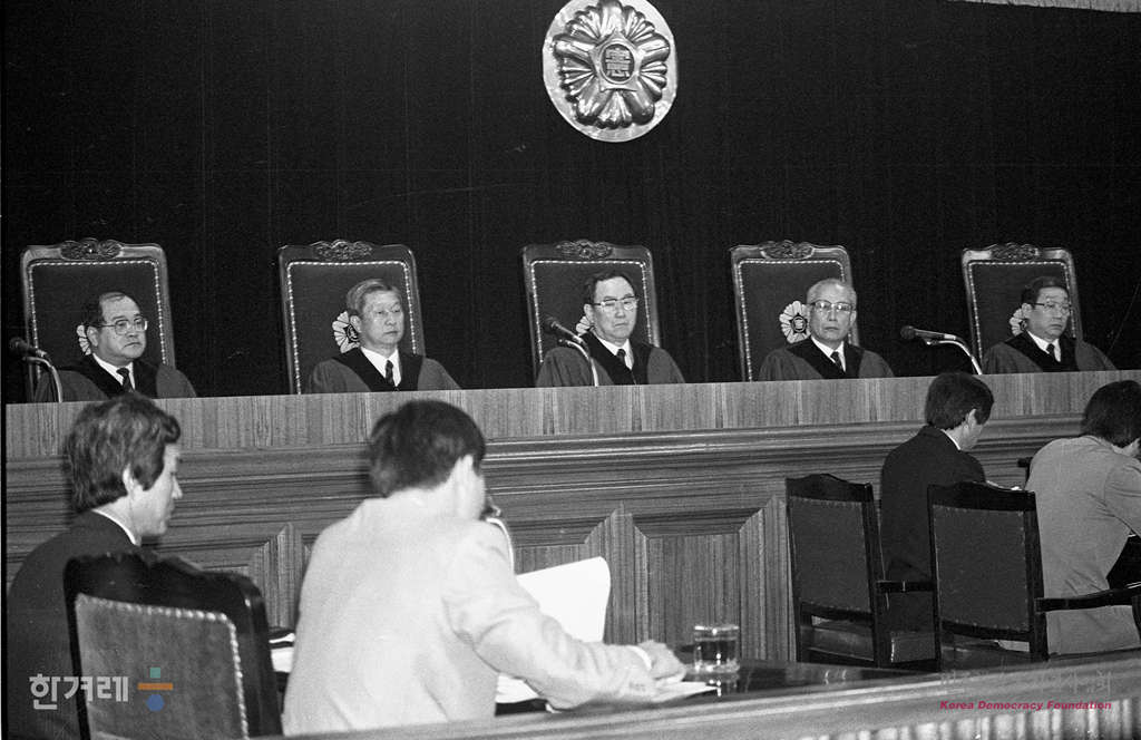 - 1990년 4월 16일 정원식 문교부장관과 이수호 전 전교조사무처장이 사립학교법 위헌심판변론을 위해 헌법재판소 재판정에 출석 악수를 나누고 있다. 정 장관은 전교조가 결성된 일 처음으로 전교조쪽 관계자를 만났다.