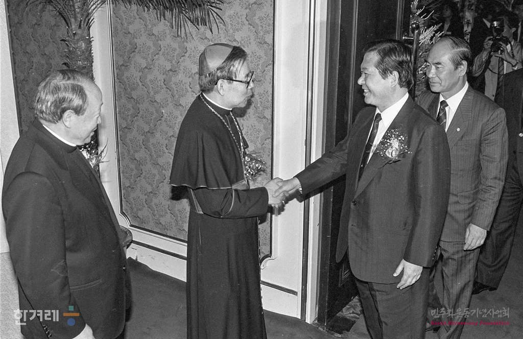 - 1990년 4월 15일 11시 천주교방송 평화방송이 개국하며 개국촉하 리셉션이 열린 서울 롯데호텔 크리스탈볼룽입구에서 김수환 추기졍이 방문자들과 인사를 나누고 있다.