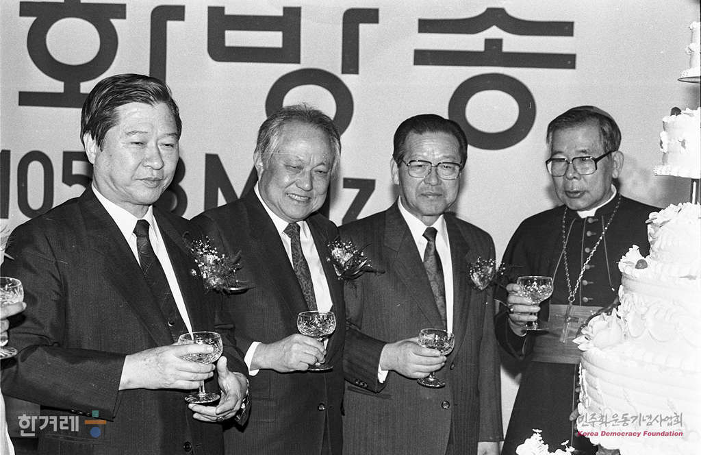 - 1990년 4월 15일 11시 천주교방송 평화방송이 개국하며 개국촉하 리셉션이 열린 서울 롯데호텔 크리스탈볼룽입구에서 김수환 추기졍이 방문자들과 인사를 나누고 있다.