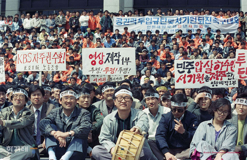 - 1990년 4월 16일 낮 12시 경찰진입과 노조원 강제연행에 항의, 신임 서기원 사장 퇴진을 요구하며 전국언론노동조합연맹이 kbs본관앞 공터에서 연맹 중앙깁행간부, 47개 회원사 노조간부 및 kbs 본사 지방국 사원 등 3천여명이 참석한 가운데 공권력 투입 규탄 및 서 사장 퇴진촉구 결의대회를 갖고 있다.