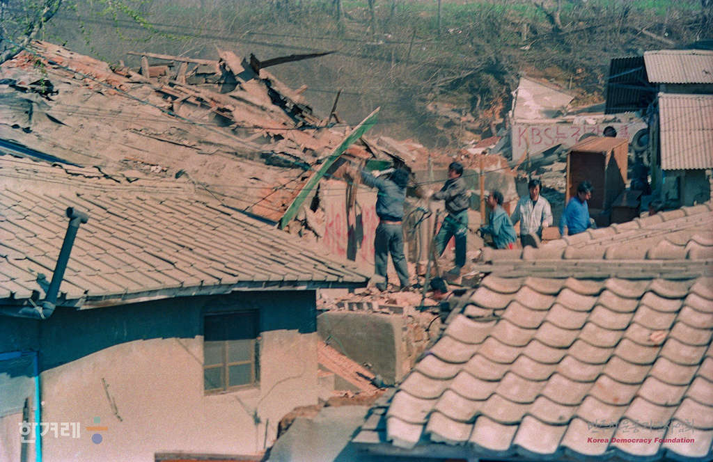 - 1990년 4월 17일 서울 동소문 돈암동 세입자 대책위원회 소속 주민들이 폐타이어 등으로바리케이트를 치며 마을 입구를 막으며 철거에 대비하고 있다.