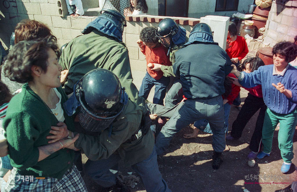 - 1990년 4월 17일 서울 동소문 돈암동 세입자 대책위원회 소속 주민들이 폐타이어 등으로바리케이트를 치며 마을 입구를 막으며 철거에 대비하고 있다.