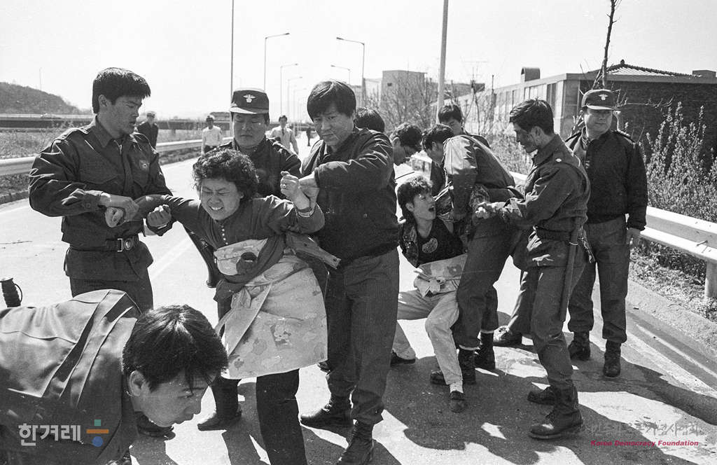 - 1990년 4월 17일 일산 신도시 건설을 반대하는 주민들이 자유로 막고 시위를 벌이다 경찰에 연행되고 있다.