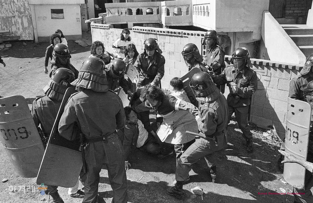 - 1990년 4월 17일 서울 동소문 돈암동 세입자 대책위원회 주민들이 강제철거에 들어가 주변을 막고 있던 경찰과 몸싸움을 하고 있다.