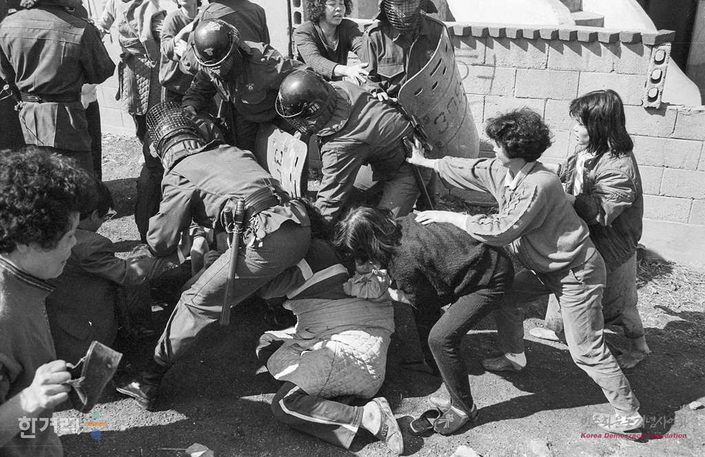 - 1990년 4월 17일 서울 동소문 돈암동 세입자 대책위원회 주민들이 강제철거에 들어가 주변을 막고 있던 경찰과 몸싸움을 하고 있다.