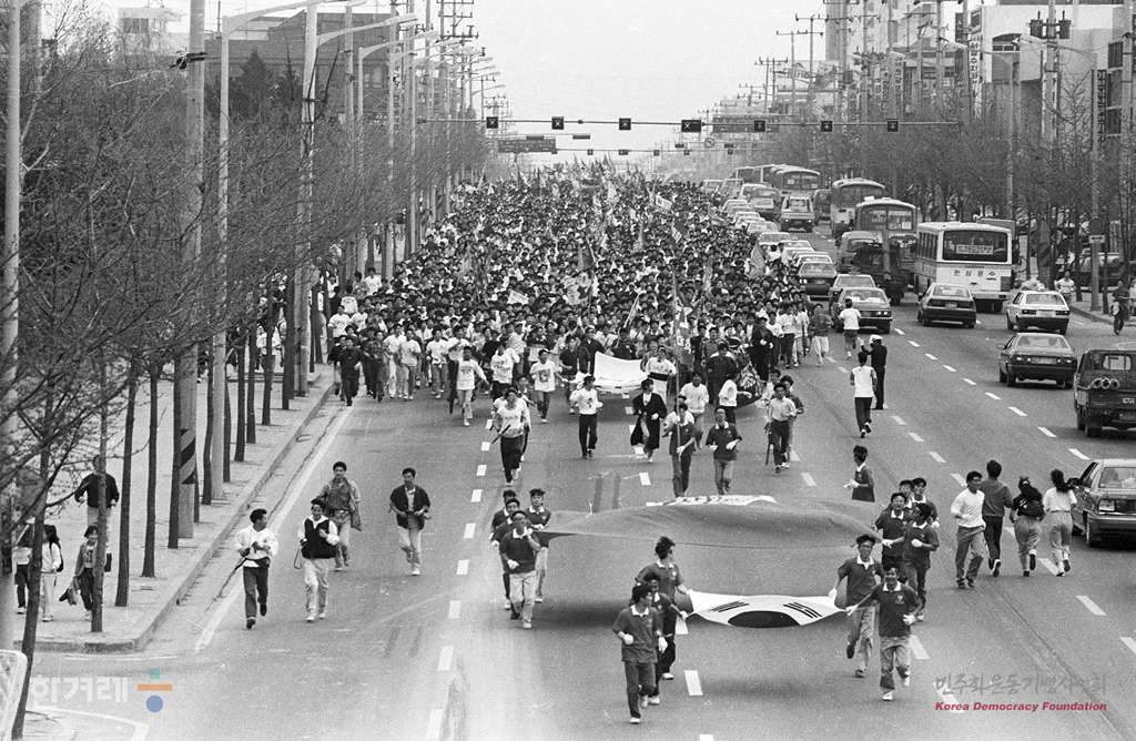 - 1990년 4월 18일 4.19 서른돌을 하루 앞두고 고려대 학생들이 기념식을 마친 뒤 서울 도봉구 수유리 4.19묘역까지 행진과 참배를 하며 그날의 의미를 되새기고 있다.
