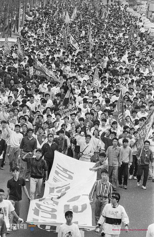 - 1990년 4월 18일 4.19 서른돌을 하루 앞두고 고려대 학생들이 기념식을 마친 뒤 서울 도봉구 수유리 4.19묘역까지 행진과 참배를 하며 그날의 의미를 되새기고 있다.