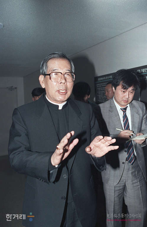 - 1990년 4월 21일 김수환 추기경이 서경원의원 방북사건 항소심 공판에서 증언하기 위해 서울고법 마당에 도착 법정으로 향하고 있다.