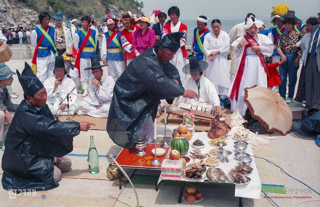 - 1990년 4월 25일 전라남도 진도군 신비의 바닷길축제가 진도 회동마을 앞바다에서 열려 많은 시민들이 참석한 가운데 영등제가 열리고 있다.