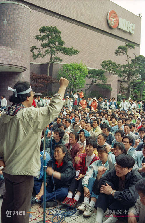 - 1990년 5월 1일 KBS에 경찰이 재투입된지 하룻만에 제작거부에 들어간 MBC 노조 조합원들이 서울 여의도 MBC 앞마당에서 KBC노조원 1천여명과 함께 방송민주화 추쟁에 동참할 것을 다짐하는 집회를 갖고 있다.