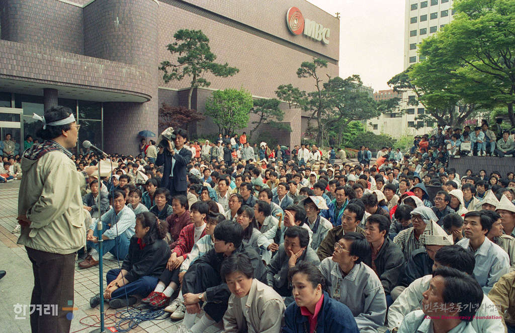- 1990년 5월 1일 KBS에 경찰이 재투입된지 하룻만에 제작거부에 들어간 MBC 노조 조합원들이 서울 여의도 MBC 앞마당에서 KBC노조원 1천여명과 함께 방송민주화 추쟁에 동참할 것을 다짐하는 집회를 갖고 있다.
