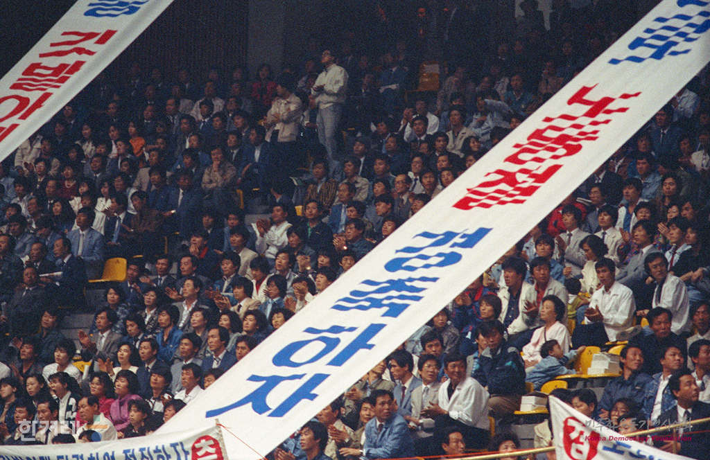 - 1990년 5월 1일 11시 30분 한국노총이 주최한 0년 노동절 기념경축대회가 서울 잠실실내체육관에서 노동자 1만여명이 참석한 가운데 열리고 있다. 한국노총이 5월1일의 메이데이행사를 갖기는 지난 59년 당시 한국노총의 전신인 대한노총이 노동절 기념일을 3월 10일로 바꾼 이래 처음이다.