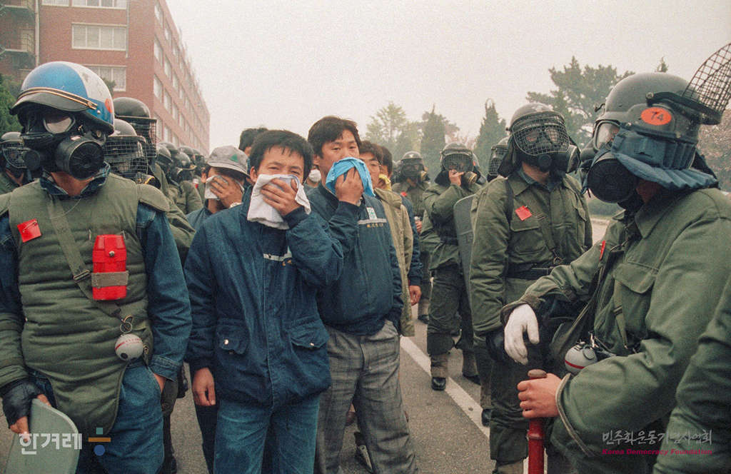 - 1990년 4월 28일 정부당국의 공권력을 투입하며 사흘째 파업농성을 벌여온 현대중공업 노조원을 강제해산시키며 농성노조원을 연행하고 있다.