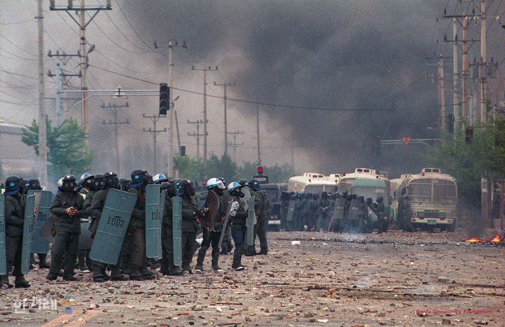 - 1990년 4월 28일 정부당국의 공권력을 투입하며 사흘째 파업농성을 벌여온 현대중공업 노조원을 강제해산시키고 있다.