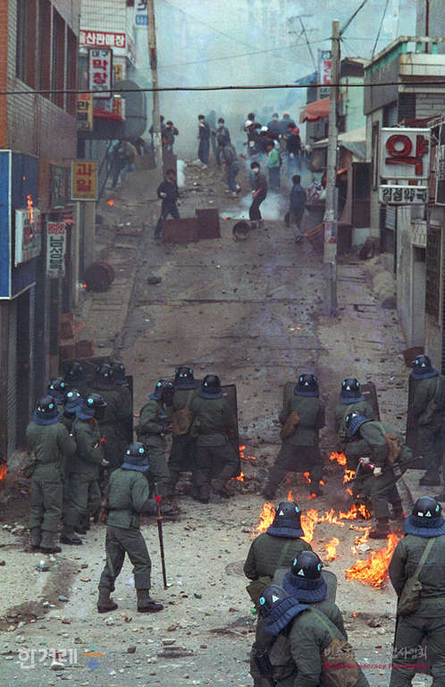 - 1990년 4월 28일 정부당국의 공권력을 투입하며 사흘째 파업농성을 벌여온 현대중공업 노조원을 강제해산시키고 있다.