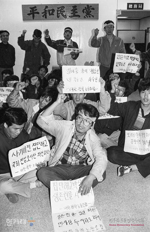 - 1990년 4월 16일 대한광학 노동자들이 서울 여의도 평민당 당사에서 공장이전으로 집단해고를 시킨 회사에 국회 진상조사단을 파견을 요구하며 농성을 하고 있다.