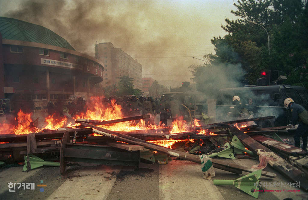 - 1990년 4월 28일 정부당국의 공권력을 투입하며 사흘째 파업농성을 벌여온 현대중공업 노조원을 강제해산시키고 있다.
