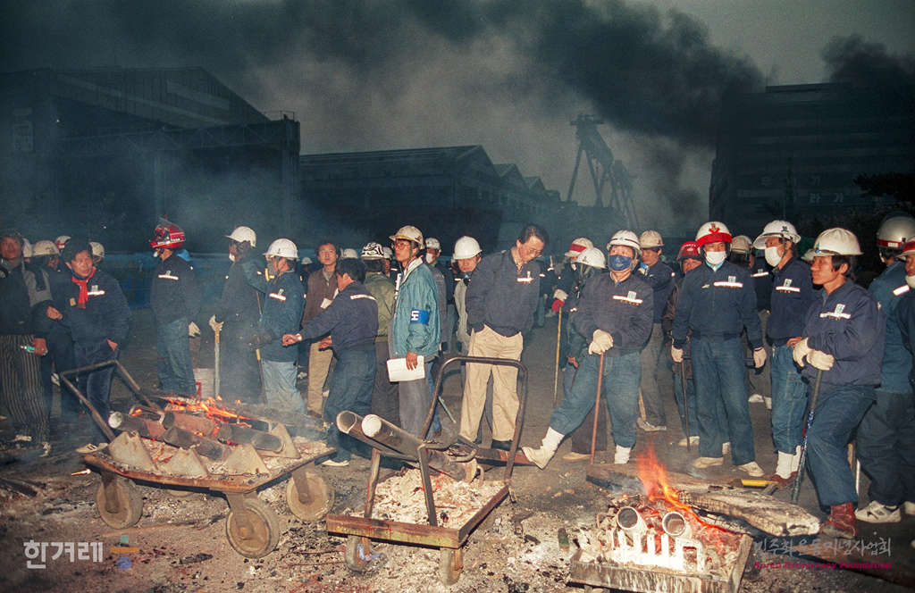 - 1990년 4월 28일 정부당국의 공권력을 투입이 예상되자 현대중공업 노조원들이 회사정문에 모여 불이 지피며 경찰의 강제진압에 대비를 하고 있다.