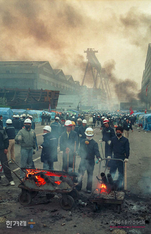 - 1990년 4월 28일 정부당국의 공권력을 투입이 예상되자 현대중공업 노조원들이 회사정문에 모여 불이 지피며 경찰의 강제진압에 대비를 하고 있다.