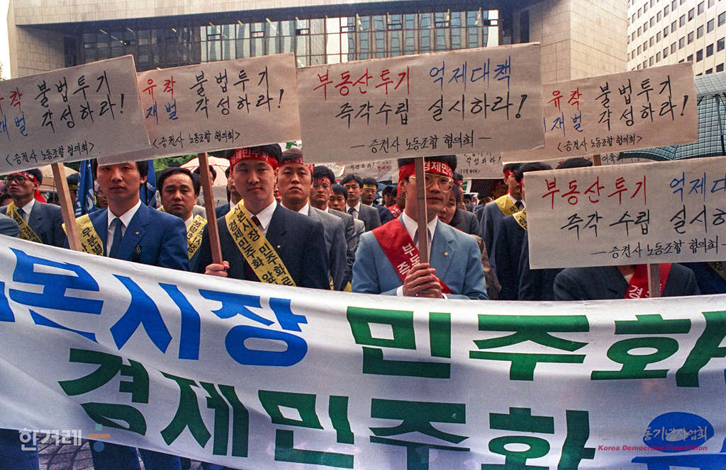 - 1990년 5월 3일 오전 10시 대우 건설 등 21개 증권회사 노조원 4백여명은 서울 여의도 증권회관앞에서 경제민주화 실현을 위한 증권노동자 결의대회를 갖고 자본시장의 건정한 육성대핵 마련과 개별위주의 경제정책 철폐 등을 정부에 요구하고 있다.