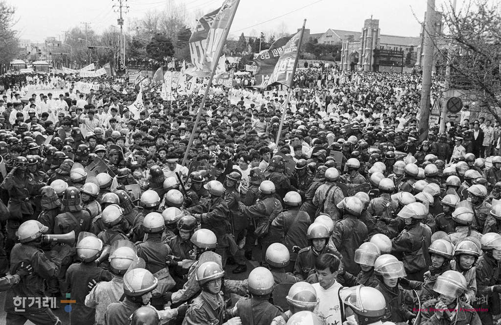 - 1991년 4월 18일 4.19혁명 31돌을 맞아 서울 안암동 고려대생들이 4.18기념식을 교내에서 마친뒤 4.19묘소 참배 행진을 위해 교문을 나서자 경찰이 저지하고 있다.
