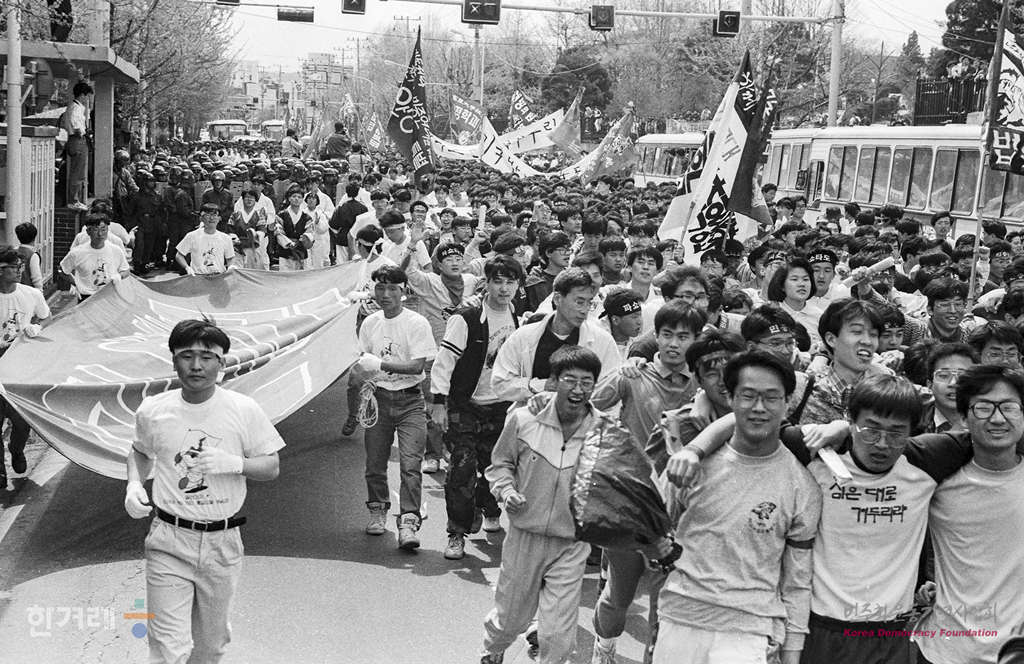 - 1991년 4월 18일 4.19혁명 31돌을 맞아 서울 안암동 고려대생들이 4.18기념식을 교내에서 마친뒤 4.19묘소 참배 행진을 위해 교문을 나서자 경찰이 저지하고 있다.