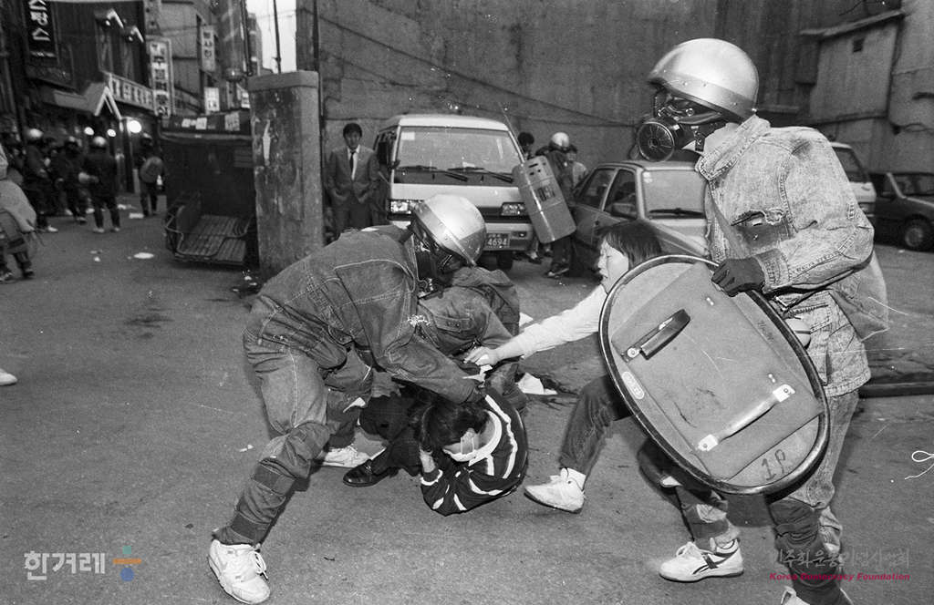 - 1991년 4월 19일 오후6시 민자당 일당독재 분쇄와 민중기본권 쟁취 국민연합이 서울 종로 파고다공원에서 노정권 퇴진 국민대회를 가지려 했으나 경찰이 저지로 무산되자 학생 시민 재야단체 회원 3천여명은 종로서적앞 8차선 도로를 점거한 채 시위를 벌이다 경찰에 연행되고 있다.