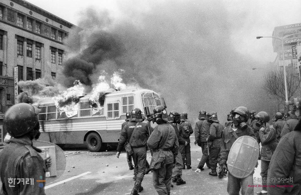 - 1991년 4월 19일 오후6시 민자당 일당독재 분쇄와 민중기본권 쟁취 국민연합이 서울 종로 파고다공원에서 노정권 퇴진 국민대회를 가지려 했으나 경찰이 저지로 무산되자 학생 시민 재야단체 회원 5천여명은 종로서적앞 8차선 도로를 점거한 채 시위를 벌이고 있다.