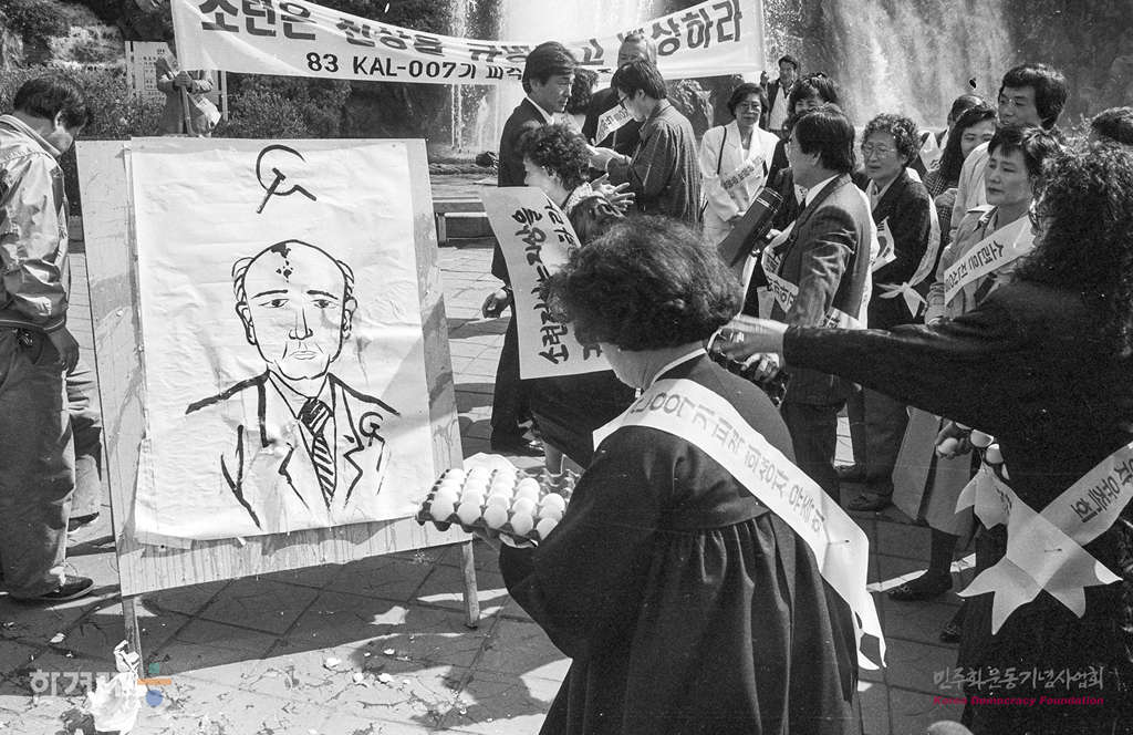- 1991년 4월 19일 오전 10시 83년 소련상공에서 격추된 대한항공 007기 희생자유족회 회원 30여명은 고르바초프 소련 대통령의 한국방문과 관련해 서울 영등포구 양화동 인공폭포 앞에서 KAL기 격추 진상규명 촉구대회를 하고 있다. 유족대표들은 이어 오후 고르바초프 대통령이 도락하는 제주공항으로 가 시위를 벌일 예정이었으나 경찰의 저지를 받아 제주행 항공기를 타지 못했다.