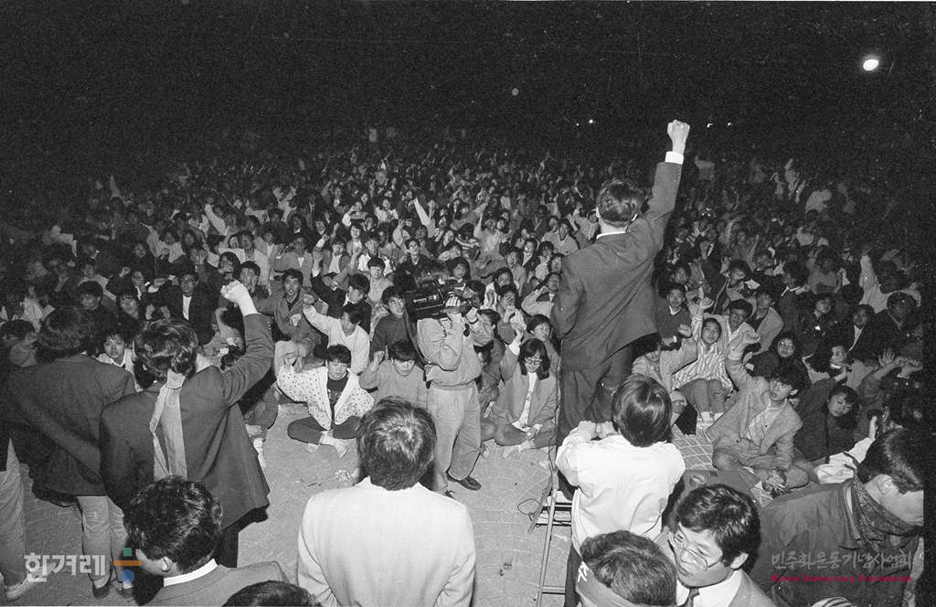 - 1991년 4월 19일 오후6시 민자당 일당독재 분쇄와 민중기본권 쟁취 국민연합이 서울 종로 파고다공원에서 노정권 퇴진 국민대회를 가지려 했으나 경찰이 저지로 무산되자 학생 시민 재야단체 회원 5천여명은 종로서적앞 8차선 도로를 점거한 채 시위를 벌이고 있다.
