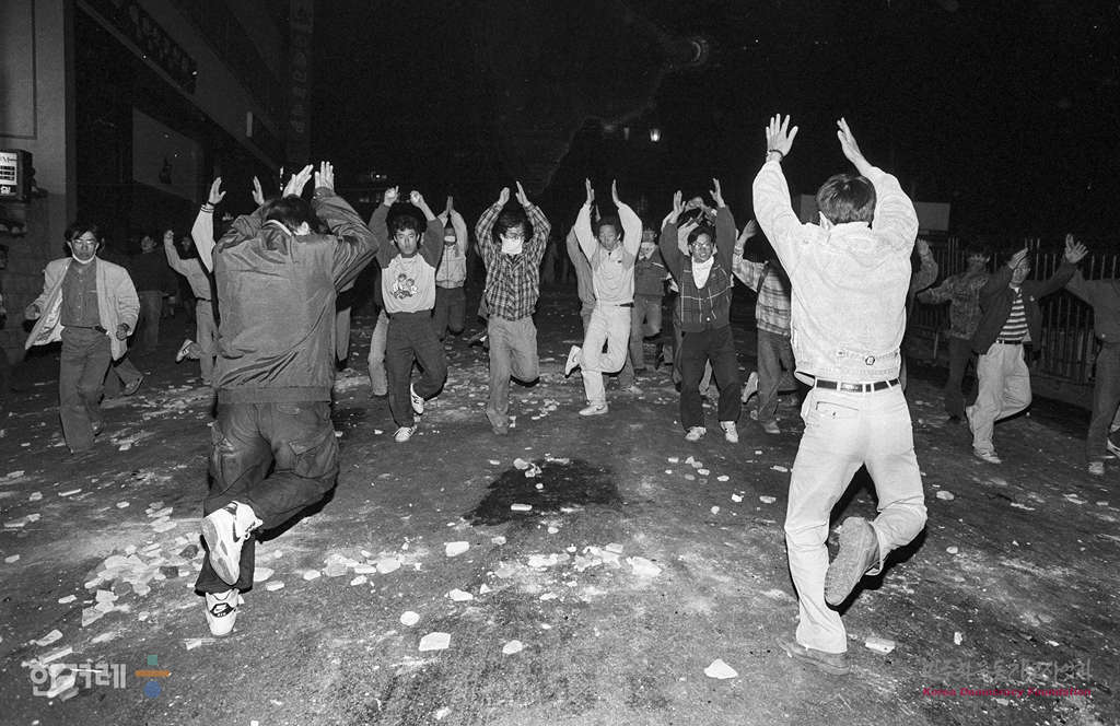 - 1991년 4월 19일 오후6시 민자당 일당독재 분쇄와 민중기본권 쟁취 국민연합이 서울 종로 파고다공원에서 노정권 퇴진 국민대회를 가지려 했으나 경찰이 저지로 무산되자 학생 시민 재야단체 회원 5천여명은 종로서적앞 8차선 도로를 점거한 채 시위를 벌이고 있다.