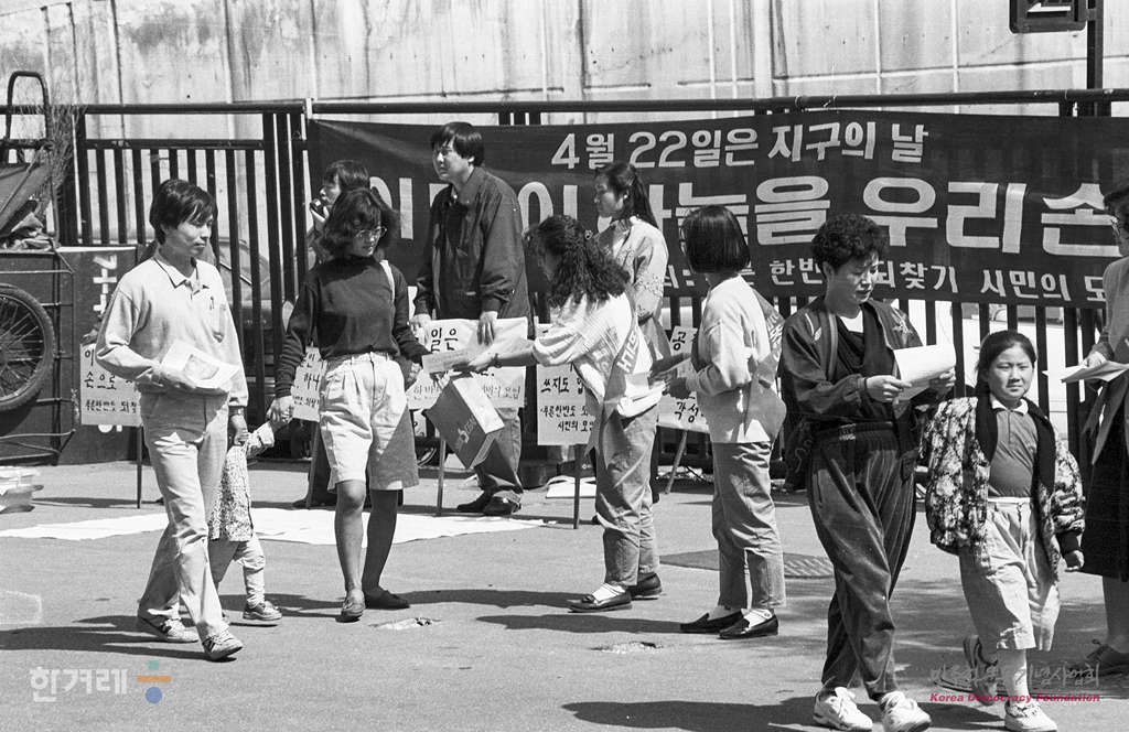 - 1991년 4월 21일 지구의 날을 기념하는 캠페인이 전국에서 벌어져 환경보전의 실천을 다짐하는 가운데 푸른 한반도 되찾기 시민의모임 회원들이 서울 명동성당 입구에서 공해상품을 사지도 쓰지도 말자는 캠페인을 벌이고 있다.