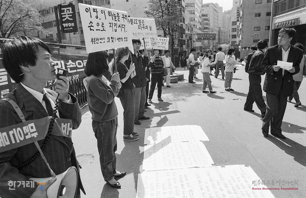 - 1991년 4월 21일 지구의 날을 기념하는 캠페인이 전국에서 벌어져 환경보전의 실천을 다짐하는 가운데 푸른 한반도 되찾기 시민의모임 회원들이 서울 명동성당 입구에서 공해상품을 사지도 쓰지도 말자는 캠페인을 벌이고 있다.