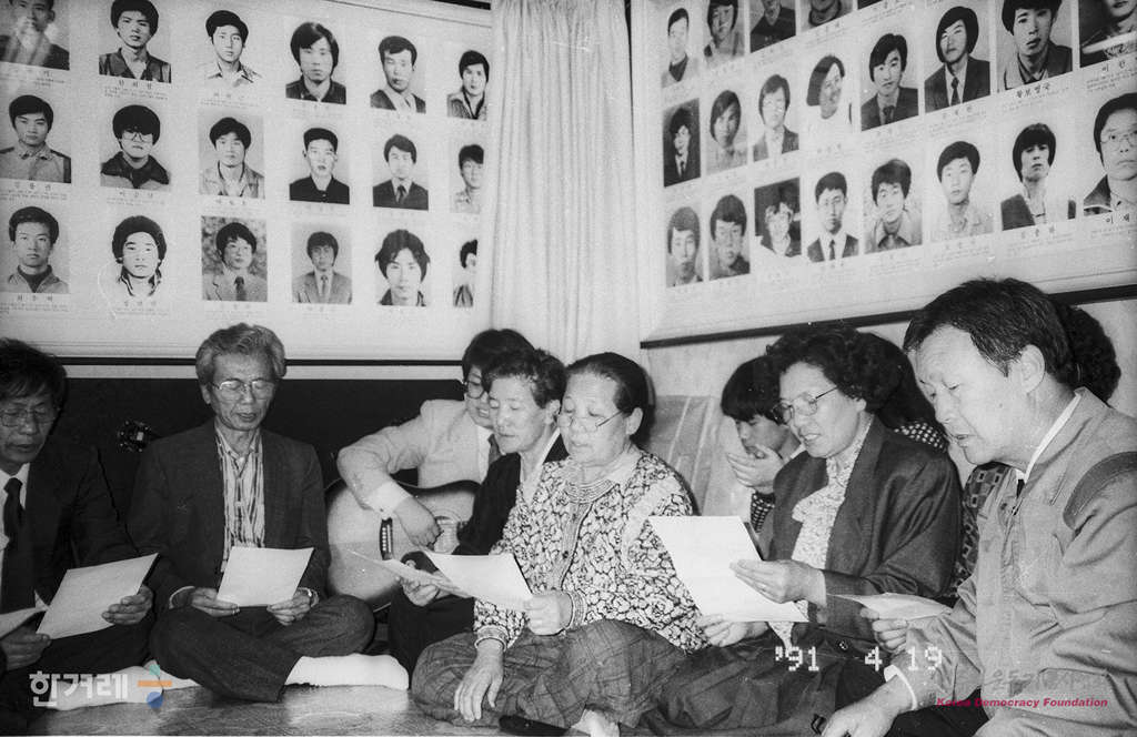 - 1991년 4월 20일 박정기씨를 비롯한전국민족민주유가족협의회 소속 회원들이 서울 동대문구 창신동 유가협 사무실 겸 거주공간이 한울삶에서 오는 4월 27일 연세대에서 열리는 노래공연 <어머니의 노래>에 부를 노래를 연습하고 있다.