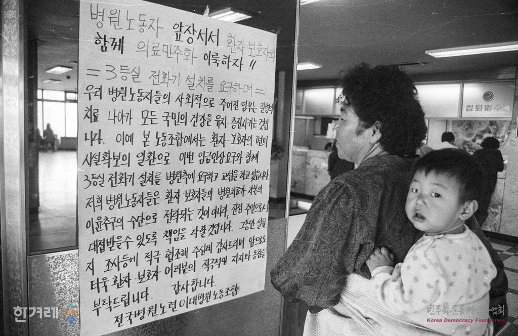 - 1991년 4월 22일 병원과 단체교섭중인 전국병원노련 산하 이대병원노동조합이 병원 로비에 붙여놓은 의료민주화 관련 실천방안에 대한 대자보를 방문객들이 관심있게 보고 있다.