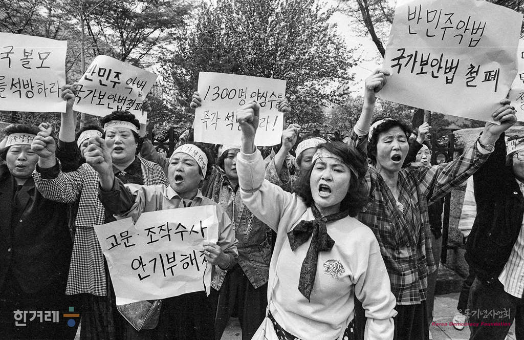 - 1991년 4월 22일 민주화실천가족운동협의회 회원들이 임시국회가 열리고 있는 서울 여의도 국회의사당 앞에서 국가보안법 철폐 등을 요구하며 시위를 벌이고 있다.