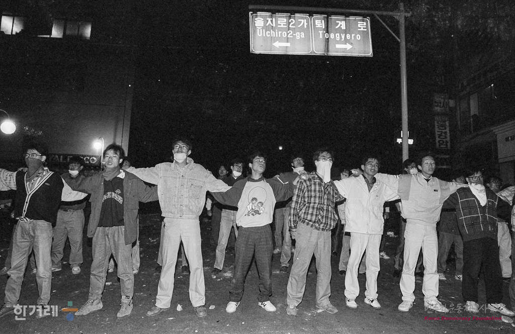 - 1991년 4월 19일 오후6시 민자당 일당독재 분쇄와 민중기본권 쟁취 국민연합이 서울 종로 파고다공원에서 노정권 퇴진 국민대회를 가지려 했으나 경찰이 저지로 무산되자 학생 시민 재야단체 회원 5천여명은 종로서적앞 8차선 도로를 점거한 채 시위를 벌이고 있다.