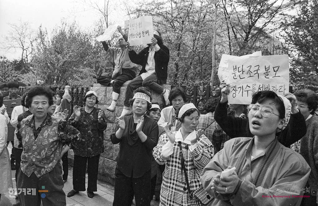 - 1991년 4월 22일 민주화실천가족운동협의회 회원들이 임시국회가 열리고 있는 서울 여의도 국회의사당 앞에서 국가보안법 철폐 등을 요구하며 시위를 벌이고 있다.