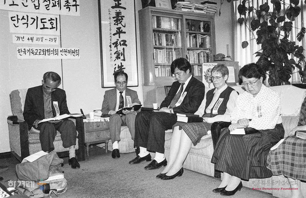 - 1991년 4월 23일 오후1시 박형규 목사 등 한국기독교교회협의회 인권위원회 중앙위원과 구속자 가족 30여명은 서울 종로구 연지동 기독교회관 2층 인권위 사무실에서 국가보안법 철폐와 양심수 석방 등을 요구하며 3일간 단식농성에 들어가며 기도를 하고 있다.