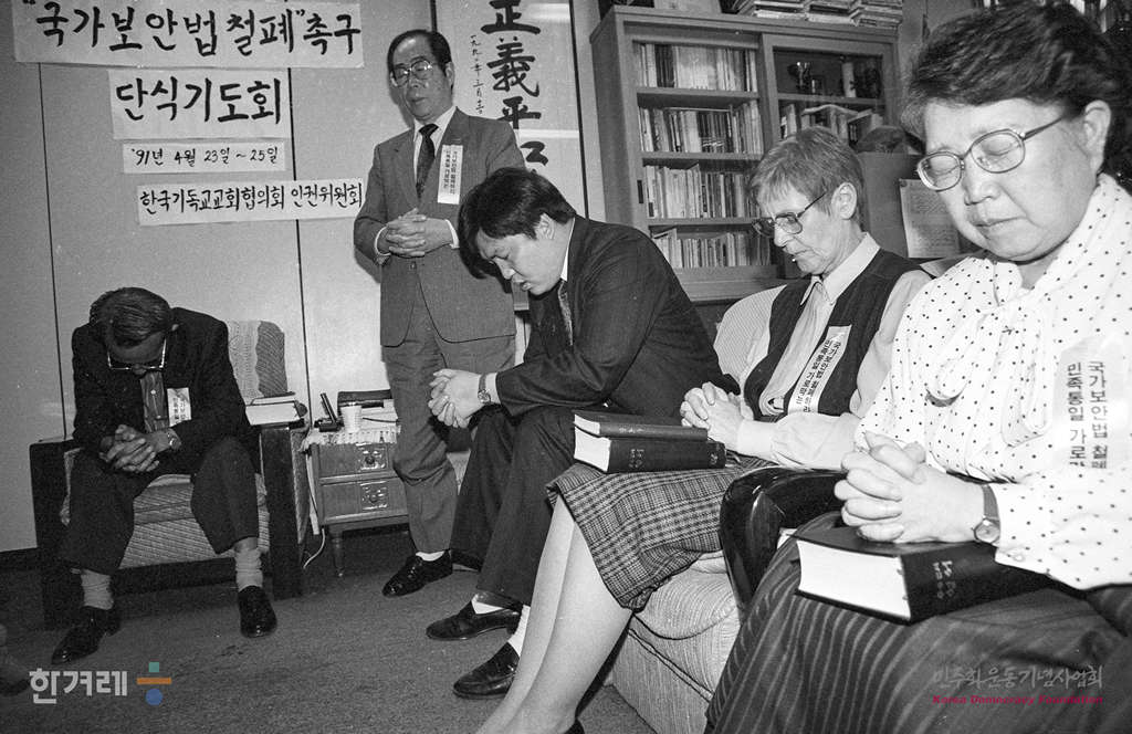 - 1991년 4월 23일 오후1시 박형규 목사 등 한국기독교교회협의회 인권위원회 중앙위원과 구속자 가족 30여명은 서울 종로구 연지동 기독교회관 2층 인권위 사무실에서 국가보안법 철폐와 양심수 석방 등을 요구하며 3일간 단식농성에 들어가며 기도를 하고 있다.
