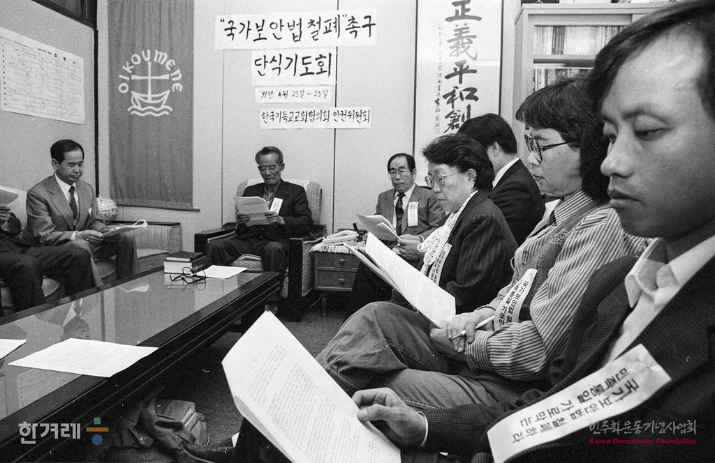 - 1991년 4월 23일 오후1시 박형규 목사 등 한국기독교교회협의회 인권위원회 중앙위원과 구속자 가족 30여명은 서울 종로구 연지동 기독교회관 2층 인권위 사무실에서 국가보안법 철폐와 양심수 석방 등을 요구하며 3일간 단식농성에 들어가며 기도를 하고 있다.