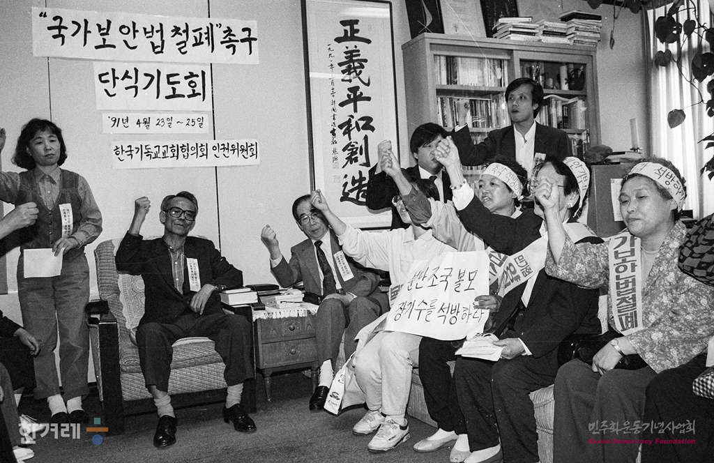 - 1991년 4월 23일 오후1시 박형규 목사 등 한국기독교교회협의회 인권위원회 중앙위원과 구속자 가족 30여명은 서울 종로구 연지동 기독교회관 2층 인권위 사무실에서 국가보안법 철폐와 양심수 석방 등을 요구하며 3일간 단식농성에 들어가며 기도를 하고 있다.