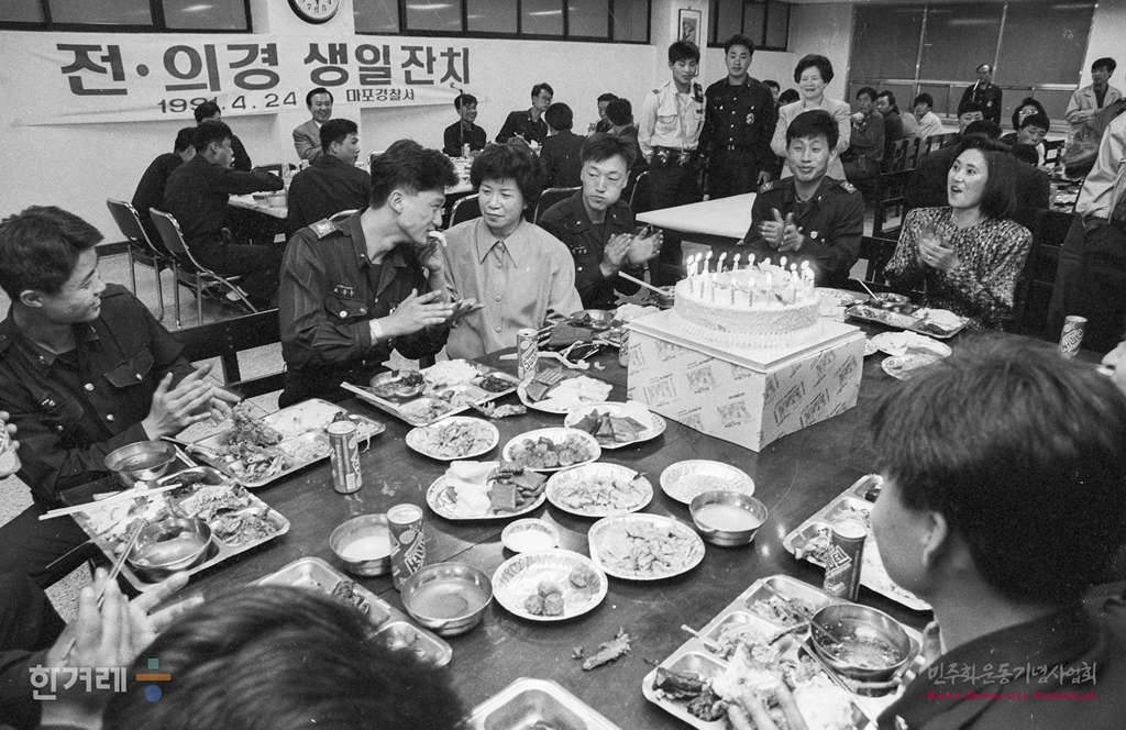 - 1991년 4월 24일 서울마포경찰서에서 전의경 어머니들이 준비한 케이크와 과일 등을 차려놓고 전의경 생일잔치를 하고 있다.
