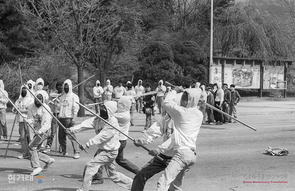 - 1991년 4월 24일 16mm소형영화 <어머니 당신의아들>의 상영을 둘러싼 충돌이 계속되는 가운데 경찰이 영화 상영을 저지하기 위해 서울대 구내로 집입하자 학생들이 돌과 화염병을 던지며 격렬히 저지하고 있다. 서울대 총학생회는 교내 문화관 대강당에서 학생 2천여명이 참석한 가운데 이 영화 상영을 강행했다.