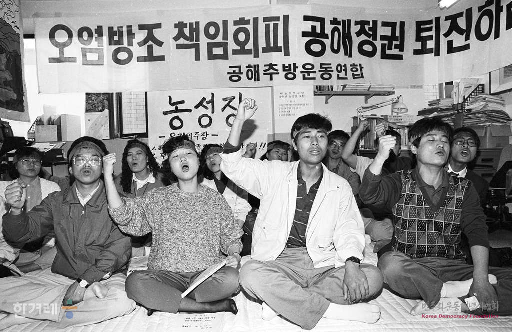- 1991년 4월 25일 정부가 두산전자 구미공장의 2차 페놀유출사고와 관련 환경처장관과 차관을 경질하는 선에서 문책인사를 끝내고 이를 수사중인 대구지검이 수사를 종결하자 서울 종로구 공해추방운동연합 사무실에서 관계자들이 철저한 진상규명과 두산전자 패쇄 등을 요구하며 농성을 하고 있다.