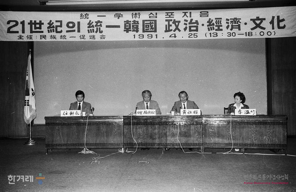 - 1991년 4월 25일 민족통일촉진회가 세종문화회관 대강당에서 가진 제 1회 통일학술심포지엄을 개최해 그동안 통일을 위한 교류 협상 방법을 중심으로 논의해 온 연구에서 한발 더 나아가 통일이후를 개괄적으로 그려보는 21세기의 통일한국 세미나를 하고 있다.