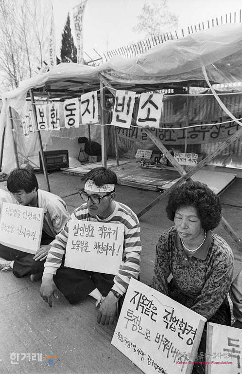 - 1991년 4월 25일 이황화탄소 중독환자가 잇따라 발생으로 물의를 빚고 있는 가운데 새로 이황환탄소 중독자로 판명된 원진레이온 노동자들이 지난 1월 5일 사망한 뒤 회사정문앞에 마련된 고 김봉환씨의 빈소앞에서 침묵농성을 벌이고 있다.