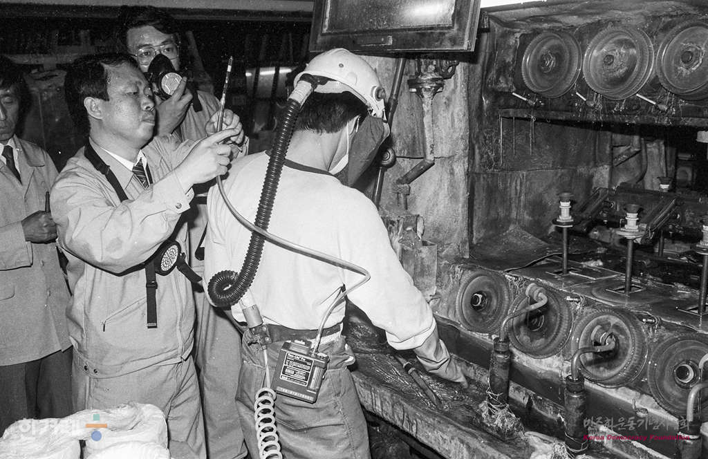 - 1991년 4월 26일 이황화탄소 중독환자가 잇따라 발생으로 물의를 빚고 있는 가운데 노동부 특별점검반이 원진레이온의 방사과 한 노동자의 몸에 유해가스 노출도를 측정하기 위해 계기를 붙이고 있다.